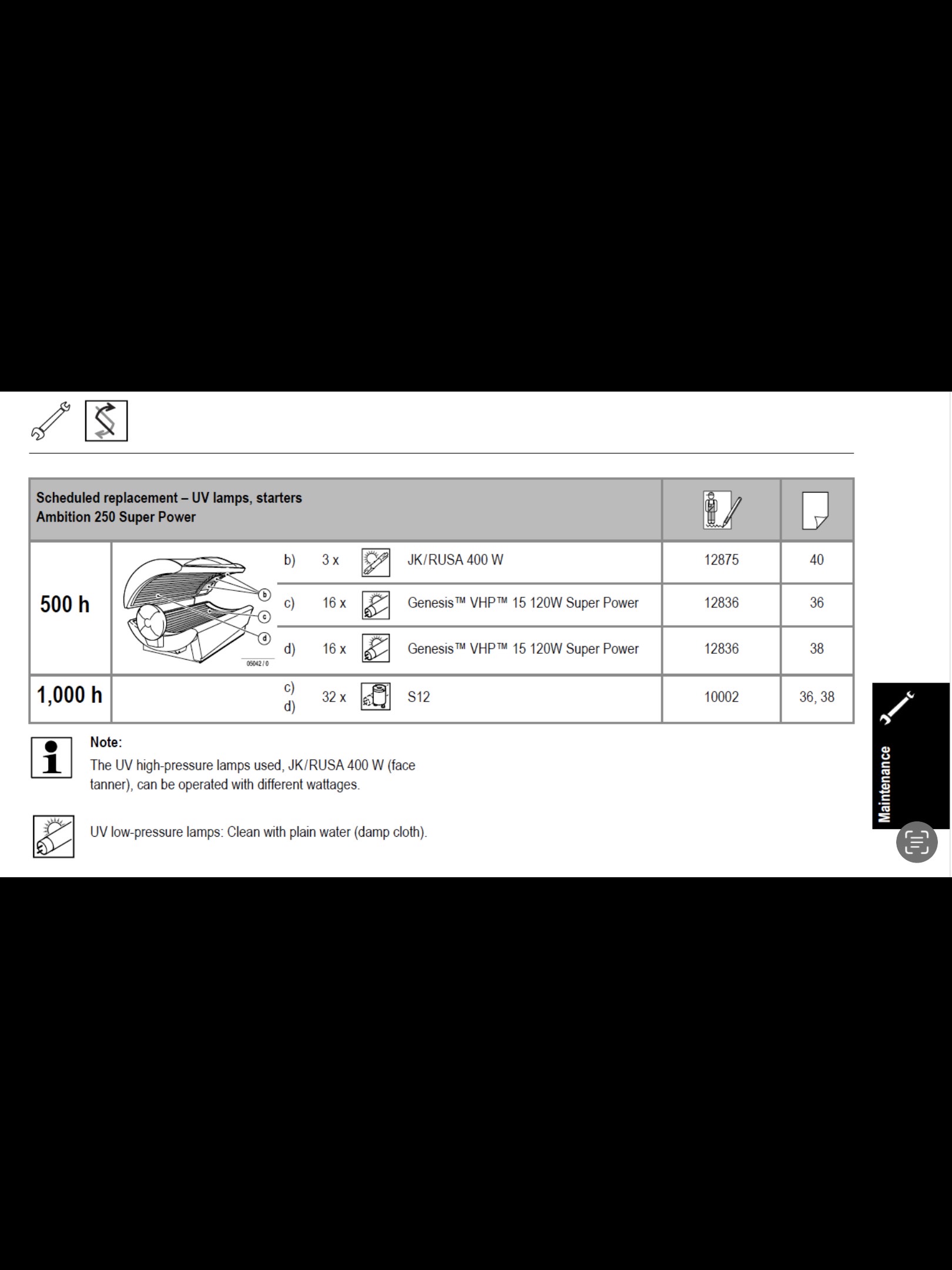 Lamp Configuration: Features 32 Genesis Turbo Power lamps—16 x 160-watt lamps in the canopy and 16 x 120-watt lamps in the bench—providing consistent and even tanning results.