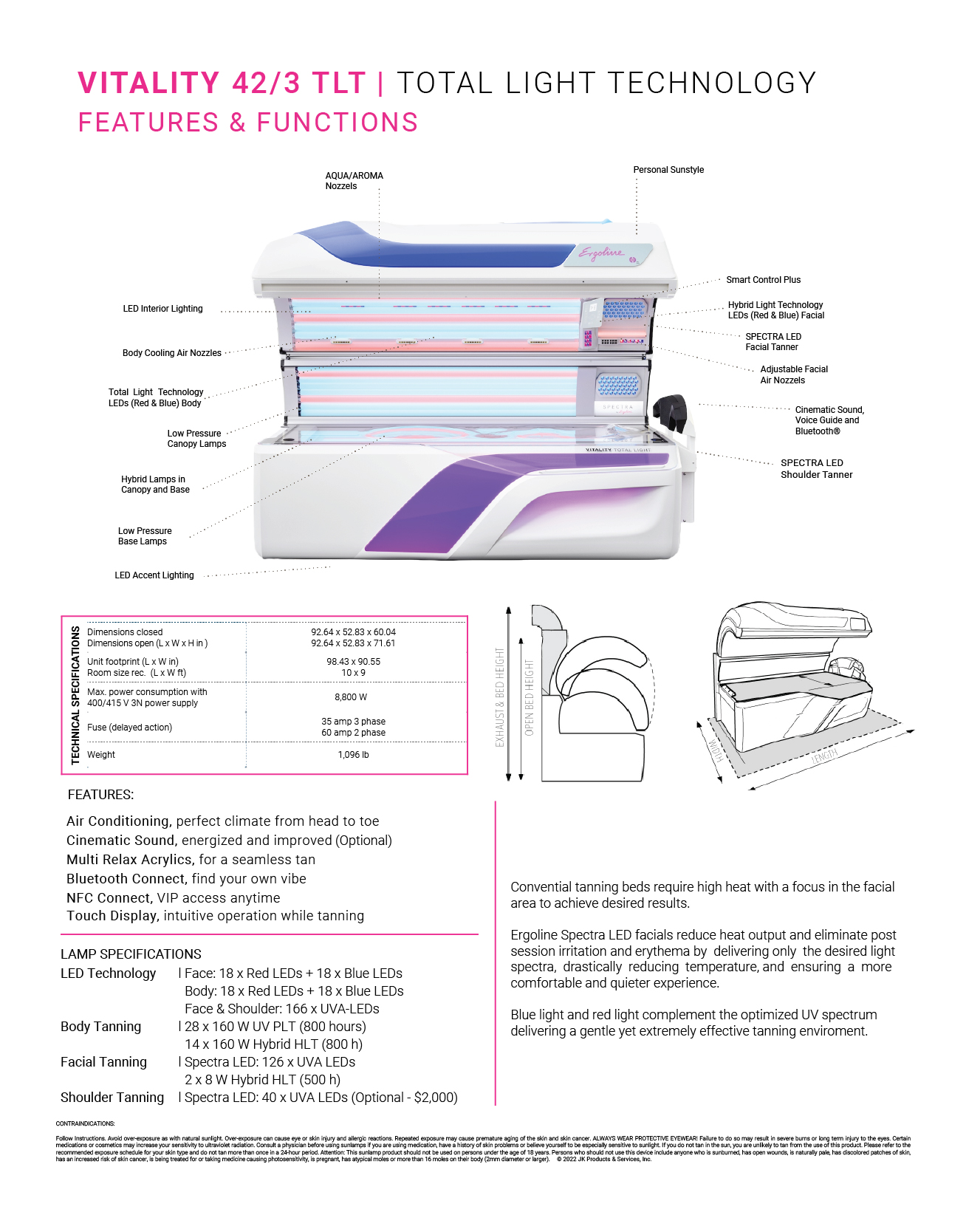Total Light Technology represents a new era in combined UV and light technology. This combination of Red Light, Blue Light and UV provides optimal tanning results and high levels of client customization to each and every session. Your customers demand the very best, and Total Light Technology is here to meet increasing demands for innovation and individualized results. The addition of Blue Light enhances the tanning environment and provides an energizing