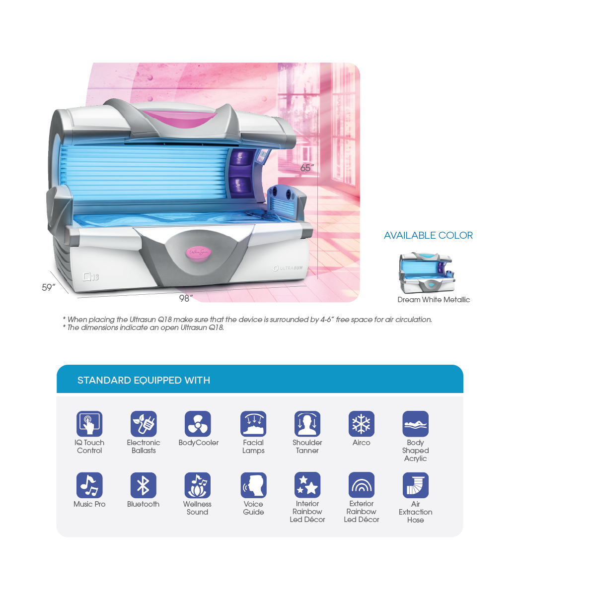The Ultrasun Q18 delivers a luxurious full-body tanning experience with precision and style. Featuring high-performance Facial Lamps and a customizable Shoulder Tanner, it ensures even, golden results from every angle. Electronic Ballasts provide consistent power, extended lamp life, and flicker-free operation.
